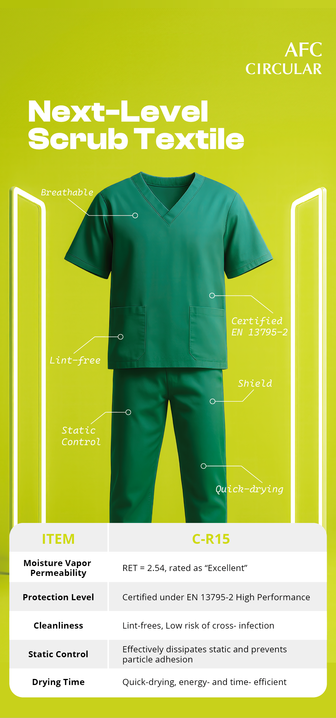 AFC® C-R15 is a next-generation scrub suit fabric engineered for high-risk surgical environments.